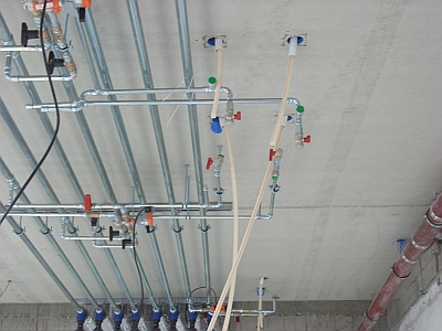 Planungsseitig war es eine besondere Herausforderung, daß innerhalb der Decken viele und unterschiedliche Aussparungen für Lampen, Lüftungs- und Leitungsdurchlässe, Taupunktfühler und Durchbrüche untergebracht werden mußten und gleichzeitig eine hohe Heiz- und Kühlleistung der Decken sichergestellt werden mußte.